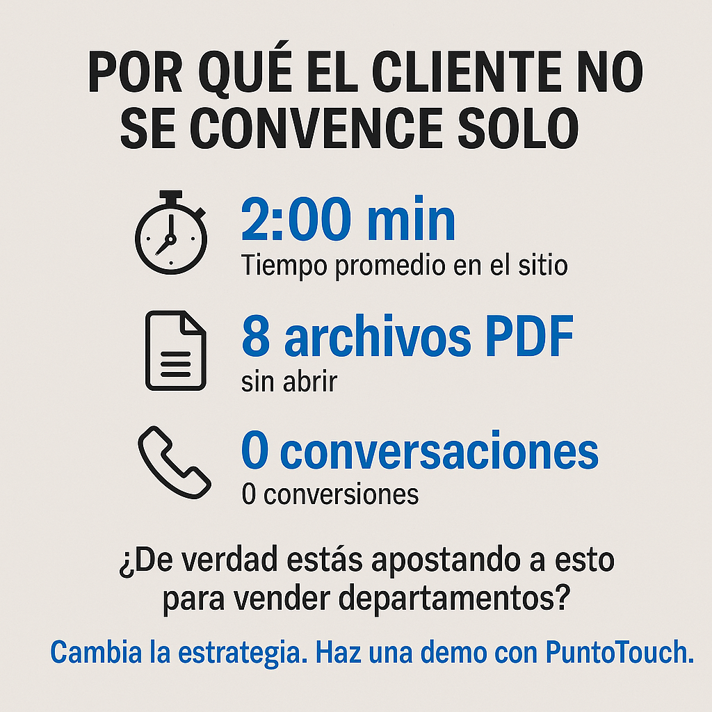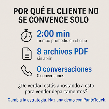 Pensar que ese cliente va a abrir planos, ver recorridos virtuales y procesar decisiones de millones de pesos es como pensar que alguien va a enamorarse de un proyecto solo por mostrarle una foto de la manilla de la puerta.