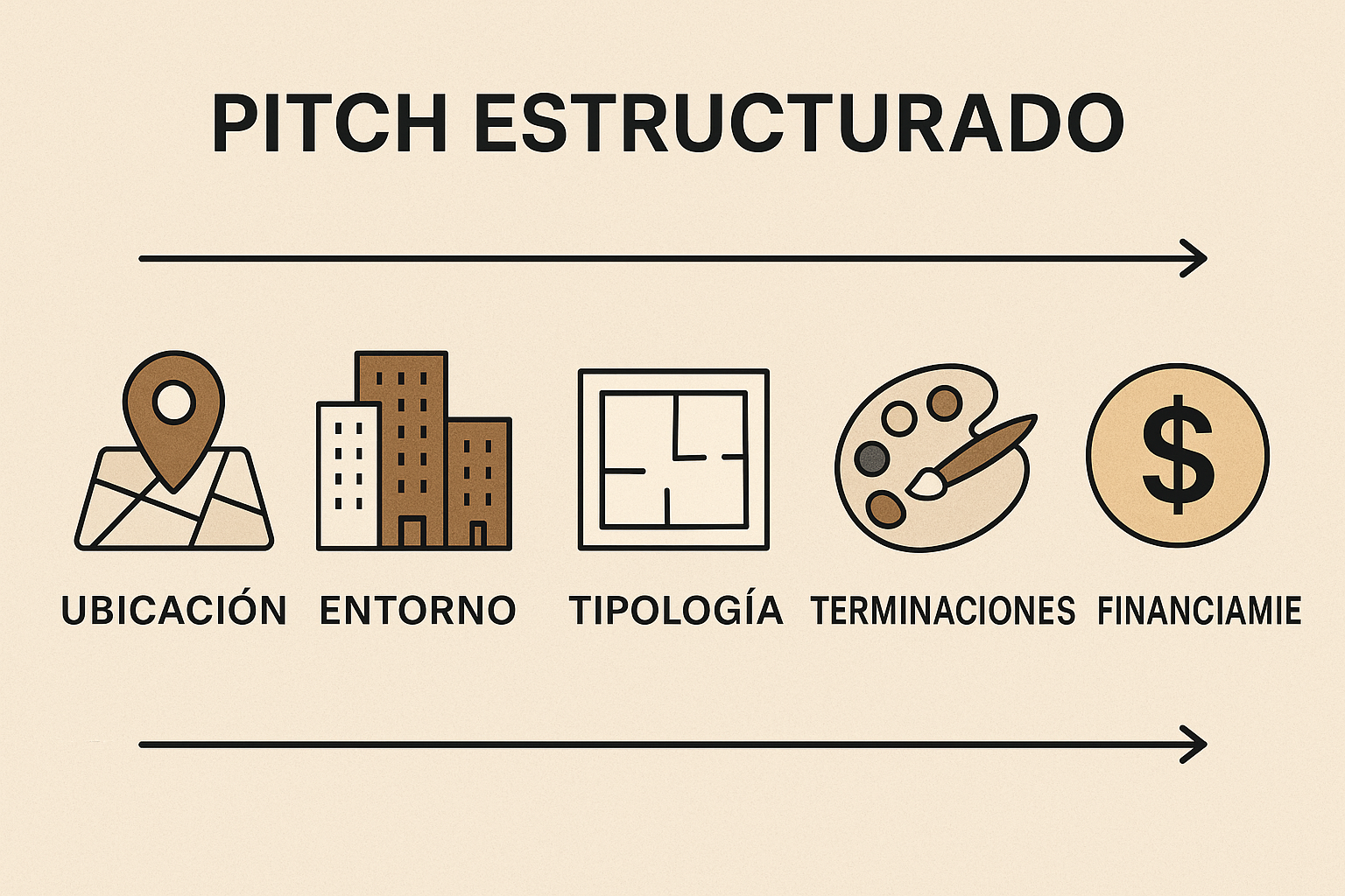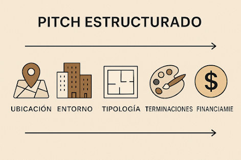 Ordena el discurso en una secuencia lógica: ubicación → entorno → tipologías → terminaciones → financiamiento.