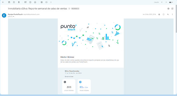 En resumen, las herramientas de captura de estadísticas y los reportes semanales de PuntoTouch son herramientas esenciales en el arsenal de cualquier agente o desarrollador inmobiliario. La información detallada sobre el uso de la aplicación y las preferencias de los usuarios permite una toma de decisiones más informada y estratégica. ¡Optimiza tu enfoque y eleva tus resultados con información valiosa entregada directamente en tu bandeja de entrada cada semana!